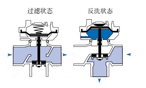 反沖洗閥應用于至少有兩個并列過濾單元的自動反沖洗過濾系統,即:在反沖洗過程中,經一個過濾單元過濾后的潔凈水作為另外一個過濾單元的沖洗水。