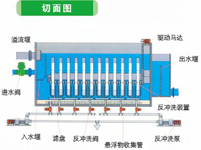 濾布轉盤微濾器主要由;濾池箱體、濾盤組、濾盤抽吸反洗機構、排泥管機構、濾盤集水中心筒、濾盤清洗驅動機構、自動控制器、抽吸清洗泵、自控閥。