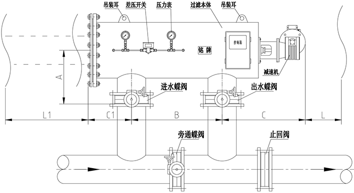 采用工業單片PLC自動控制,中文或英文顯示。可根據壓差或定時控制過濾器自動清洗,并可手動、強制清洗。現場可設定過濾時間、清洗時間。運行信號、清洗信號、故障信號輸出及485通訊接口。
