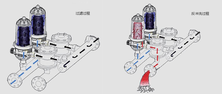 過濾系統(tǒng)有兩種運行狀態(tài):過濾狀態(tài)和反沖洗狀態(tài)。