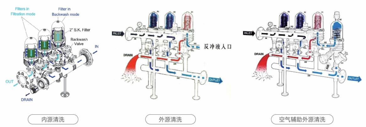 反洗模式1.內(nèi)源清洗:利用過濾液的自身壓力反沖, 要求過濾出水壓力大于2.8公斤。